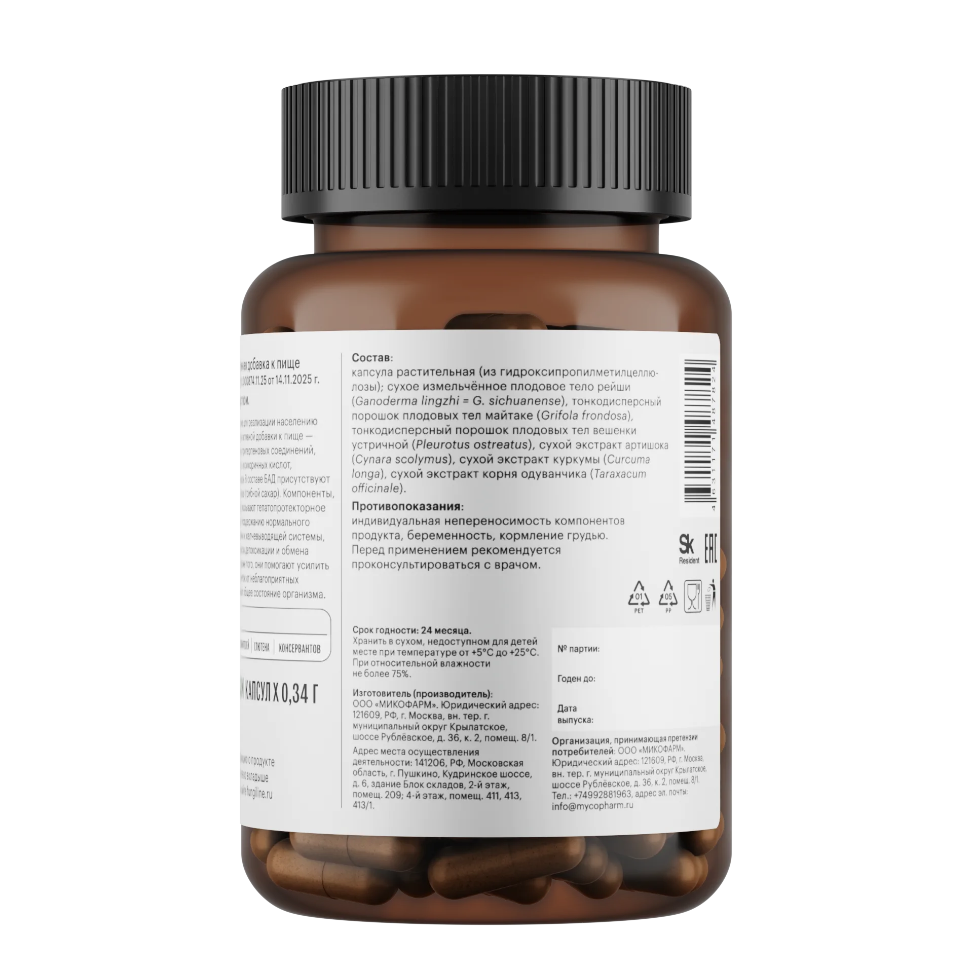 Тонкодисперсный порошок плодовых тел рейши (Ganoderma lingzhi), майтаке (Grifola frondosa), вешенки устричной (Pleurotus ostreatus) низкотемпературной сушки; экстракт куркумы (Curcuma longa), экстракт корня одуванчика (Taraxacum officinale), экстракт артишока (Cynara scolymus).